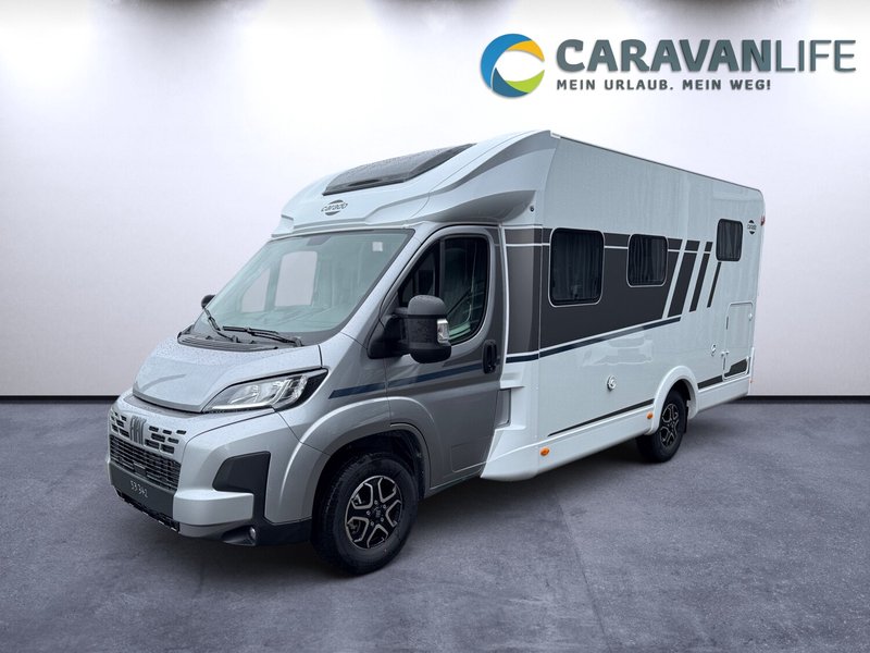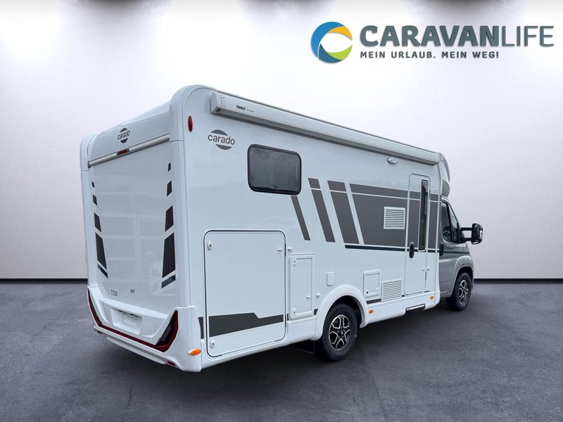 - pro+ Paket T338 (Optik Paket 1 | Stoßfänger lackiert, Optik Paket 2 | Alufelgen, Basic Paket, Chassisfarbe Artense Grau Metallic, Faltverdunkelung Fahrerhaus, Fenster in Fronthaube, Großer Kühlschrank 156 l mit separatem Frosterfach 29 l, Abwassertank isoliert, Markise 4 m, Rahmenfenster, Design Applikation Heck, Zweite Außenstauraumklappe (Größe modellabhängig), Beklebung pro+)