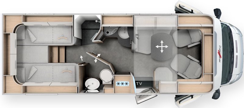 - Chassis-Komfort-Paket MB comfort (Radzierblenden, Halbautomatische Klimaanlage Tempmatik, Tempomat, Zentralverriegelung Fahrerhaustür, Außenspiegel elektrisch verstell- und beheizbar, elektr. Fensterheber, Vorbereitung (Kabelsatz) für Zentralverriegelung XL-Aufbautür, Ladebooster, Elektrische Feststellbremse, Vorderachse mit erhöhter Traglast, Lederlenkrad mit Option Multifunktionstasten (bei Schaltgetriebe inkl. Leder-Schalthebel), Lenkrad in Höhe und Neigung verstellbar, Kombiinstrument mit Farbdisplay, Regensensor, Kraftstofftank 92 Liter, Wärmedämmendes Glas mit Bandfilter an der Frontscheibe, Fahrerhauskomfortsitze mit Neigungs- und Höhenverstellung (vorn / hinten), Radiovorbereitung mit Dachantenne mit DAB+, Lautsprecher (4x), DVB-T2 Empfang, MBUX 10,2" Multimedia inkl. Navigation und DAB+, Verkehrszeichenassistent, Malibu Rückleuchten mit LED-Leuchtband, Große Garagentür auf Fahrerseite, XL-Aufbautür "premium two 2.0" (Breite 63 cm) mit Doppelverriegelung, Fenster- und Insektenschutzrollo, Fahrerhausverdunklungssystem: Plissee an Seitenscheiben und Frontscheibe, Dachluke Midi-Heki über L-Wohnsitzgruppe, Indirekte Ambientebeleuchtung Wohnraum und Küche in LED-Technik, Digitales Bedienpanel Truma CP Plus, SOG-Toilettenentlüftung, Abwasserschlauchset zur komfortablen Entsorgung, USB-Steckdose im Dachstauschrank über Heckbett, Vorbereitung Rückfahrkamera, Vorbereitung Solaranlage, Vorbereitung Sat-Anlage, Vorbereitung TV)