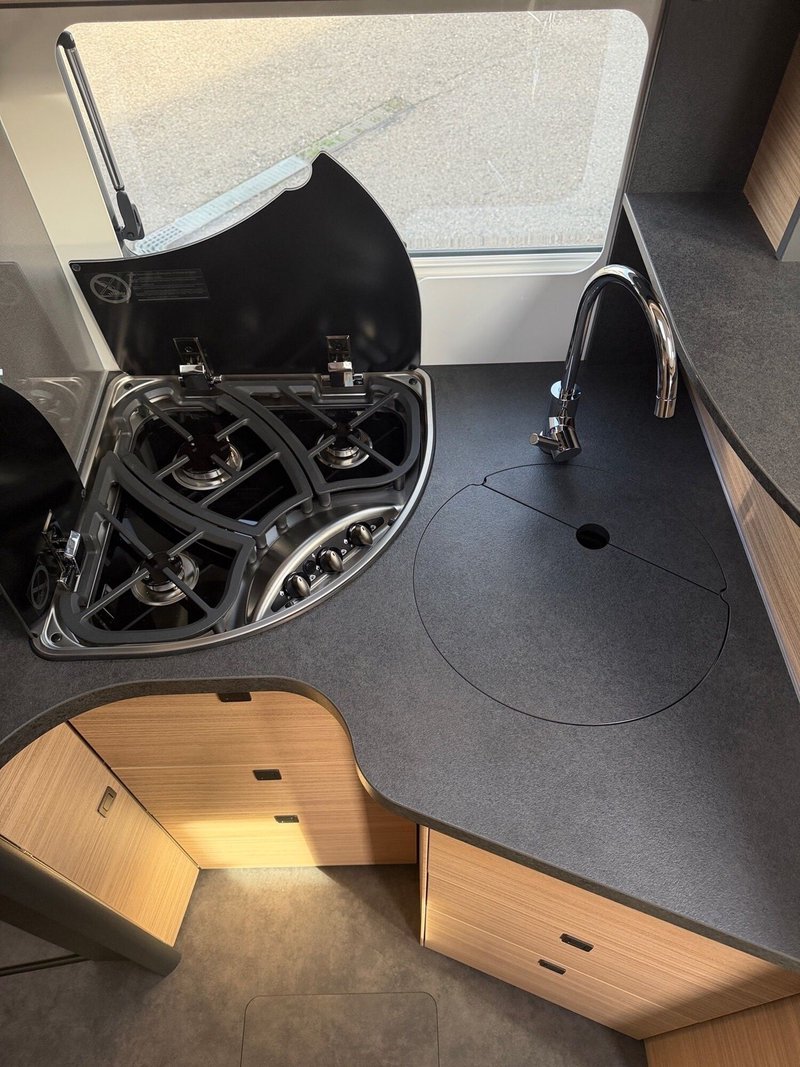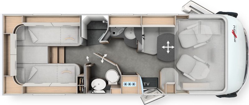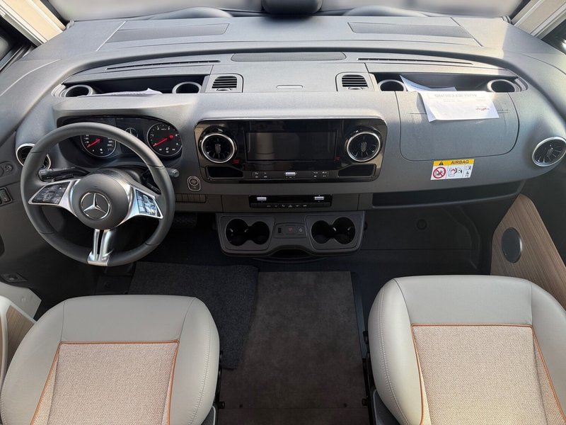 - Chassis-Komfort-Paket MB comfort (Radzierblenden, Halbautomatische Klimaanlage Tempmatik, Tempomat, Kühlergrill in Hochglanz schwarz, Vorbereitung (Kabelsatz) für Zentralverriegelung XL-Aufbautür, Ladebooster, Elektrische Feststellbremse, Vorderachse mit erhöhter Traglast, Lederlenkrad mit Option Multifunktionstasten (bei Schaltgetriebe inkl. Leder-Schalthebel), Kombiinstrument mit Farbdisplay, Regensensor, Kraftstofftank 92 Liter, Fahrerhauskomfortsitze mit Neigungs- und Höhenverstellung (vorn / hinten), Lenkrad in Höhe und Neigung verstellbar, Radiovorbereitung mit Dachantenne mit DAB+, Lautsprecher (4x), DVB-T2 Empfang, MBUX 10,2" Multimedia inkl. Navigation und DAB+, Verkehrszeichenassistent, Malibu Rückleuchten mit LED-Leuchtband, Große Garagentür auf Fahrerseite, XL-Aufbautür "premium two 2.0" (Breite 63 cm) mit Doppelverriegelung, Fenster- und Insektenschutzrollo, Hohlwaben-Isolierfrontplissee mit vertikaler Bedienung und Faltplissee Seitenscheiben, Dachluke Midi-Heki über L-Wohnsitzgruppe, Indirekte Ambientebeleuchtung Wohnraum und Küche in LED-Technik, Digitales Bedienpanel Truma CP Plus, SOG-Toilettenentlüftung, Abwasserschlauchset zur komfortablen Entsorgung, USB-Steckdose im Dachstauschrank über Heckbett, Vorbereitung Rückfahrkamera, Vorbereitung Solaranlage, Vorbereitung Sat-Anlage, Vorbereitung TV)