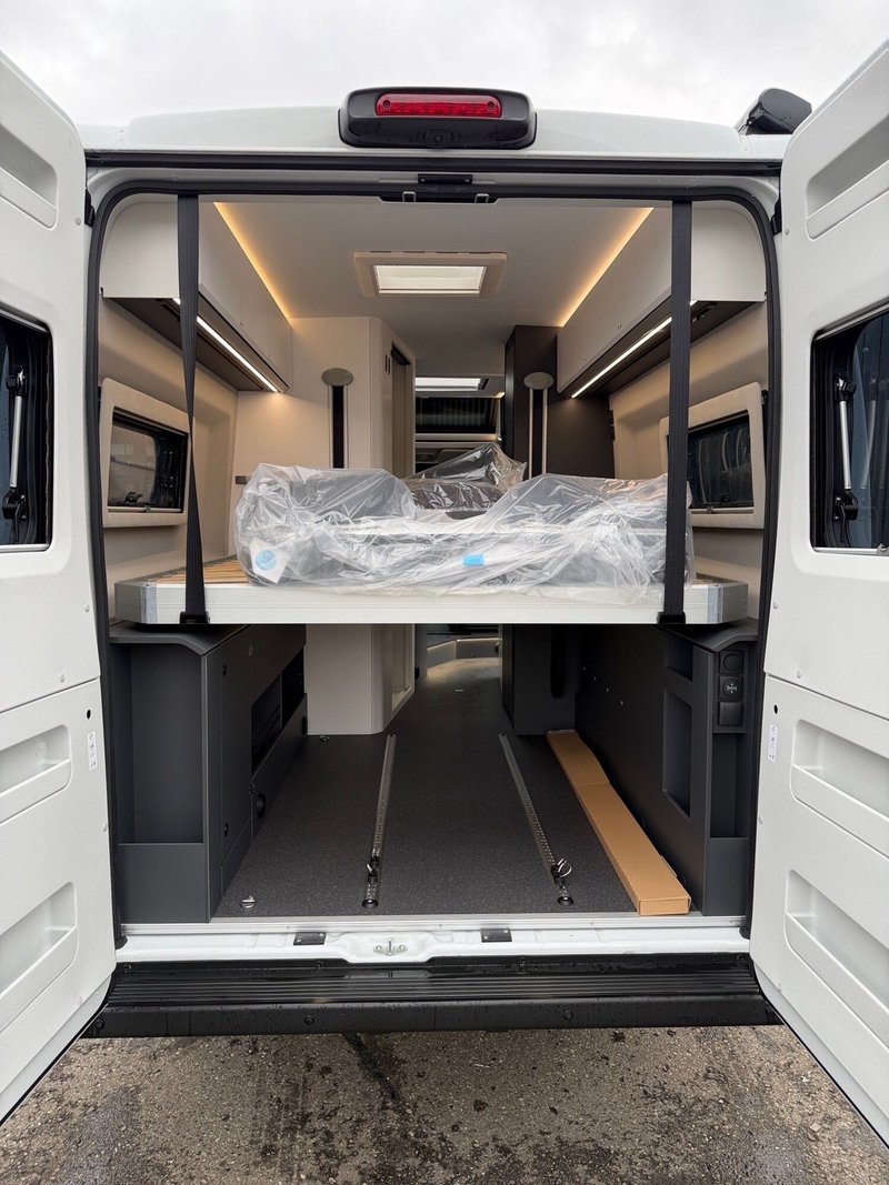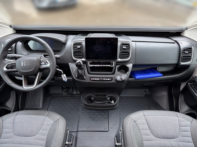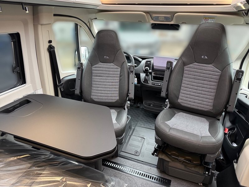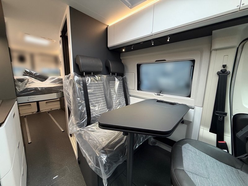 - Serienausstattung SELECTION (Kit DELUXE (Einparkhilfe hinten, Radio-Vorbereitung Fahrerhaus, Fahrerhaus- und Wohnraum-Scheiben getönt, Wohnraum-Seitenfenster mit Rahmen, Fenster inkl. Kombirollo in Hecktür links, Falt-Verdunkelung Fahrerhaus, Falt-Verdunkelung Wohnraum-Seitenfenster, Fliegenschutz an Schiebetür, Einstiegsstufe elektrisch, Einstiegsbeleuchtung, LED-Ambientebeleuchtung, Lade-Booster (für bessere Ladung während der Fahrt), Abwassertank isoliert und beheizbar, Abwasserablassventil elektrisch, Abdeckung Kocher und Spüle, Tisch mit Ausdreherweiterung und Becherhalterung), Paket SAFETY + STYLE PLUS (Regen- und Licht-Assistent, Notbrems-Assistent mit Fußgängererkennung, Spurhaltewarn-Assistent, Verkehrzeichen-Assistent (mit Tempomat-Geschwindigkeits-Anpassung), Fahrermüdigkeitserkennung, Geschwindigkeits-Assistent adaptiv mit Stop&Go (Stau-Assistent), Klimaautomatik Fahrerhaus, Handbremse elektrisch, Lenkrad in Lederoptik, 7"-Instrumentenanzeige digital, 16"-Leichtmetall-Felgen (4 Stück, statt 15"-Stahl), Lackierung Stoßfänger vorne, Nebelscheinwerfer), 10"-DAB-Naviceiver, Multifunktionslenkrad mit Radiofernbedienung, Rückfahrkamera)), LED Frontscheinwerfer, Solar Anlage, Sonnenschutz-Markise, MACH PLUS App, Panoramafenster vorne zum öffnen, Zusatzluftfederung hinten)